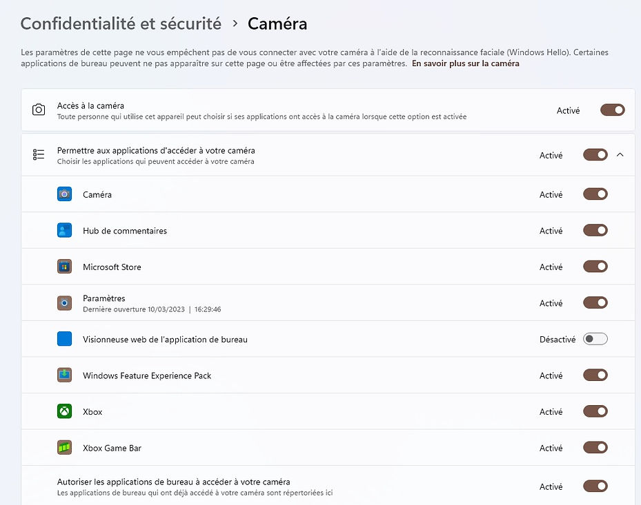 - Nouveau: Confidentialité et Sécurité: Accès des Applications à la Caméra