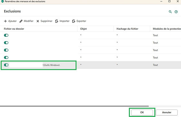 Il faudra à nouveau paramétrer les Exclusions dans Kaspersky